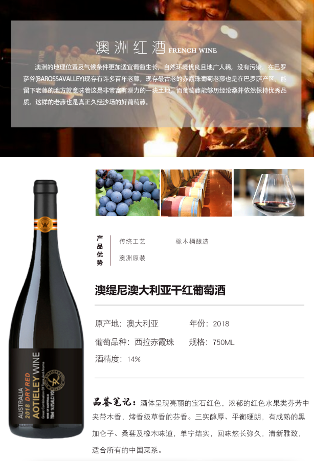 澳大利亚地理位置优越,自然环境优良,地广人稀,没有污染,绝对绿以产品。在酿酒时,普遍采用橡木桶储存及低温发酵技术,故制造出的葡萄酒以口感丰腴,并带有巧克力和水果香为其特色。澳大利亚锐意创新的酿酒扶、多元文化背景的酿酒经,以及崇尚保留葡萄品种的最高度原味和果香的酿酒哲学,使得澳洲葡萄酒充满个性和活力。