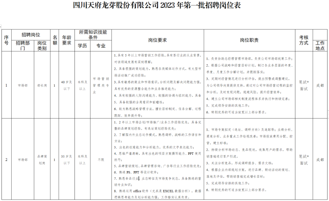 此次招聘人员共12名,招聘岗位具体要求详见附件《四川天府龙芽股份有限公司2023年第一批招聘岗位表》。