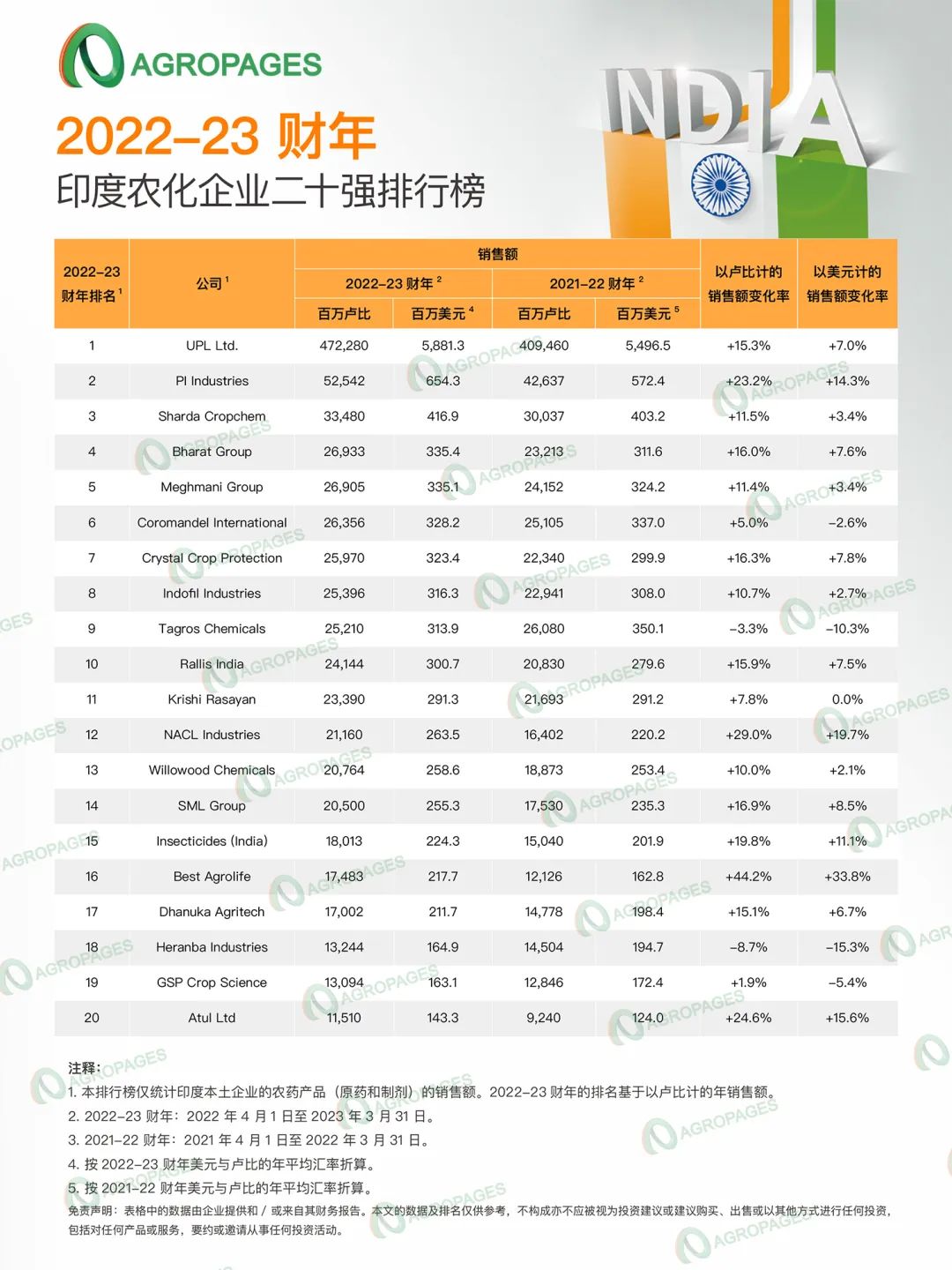 印度领先的农化企业经过多年的沉淀,已能维持稳定的发展和体量,因此榜单上的排名仅仅会根据当年的表现有微小的变化。从2022-23财年的榜单来看,销售额超过200亿卢比的公司共有14家,在100亿到200亿卢比之间的公司共6家。