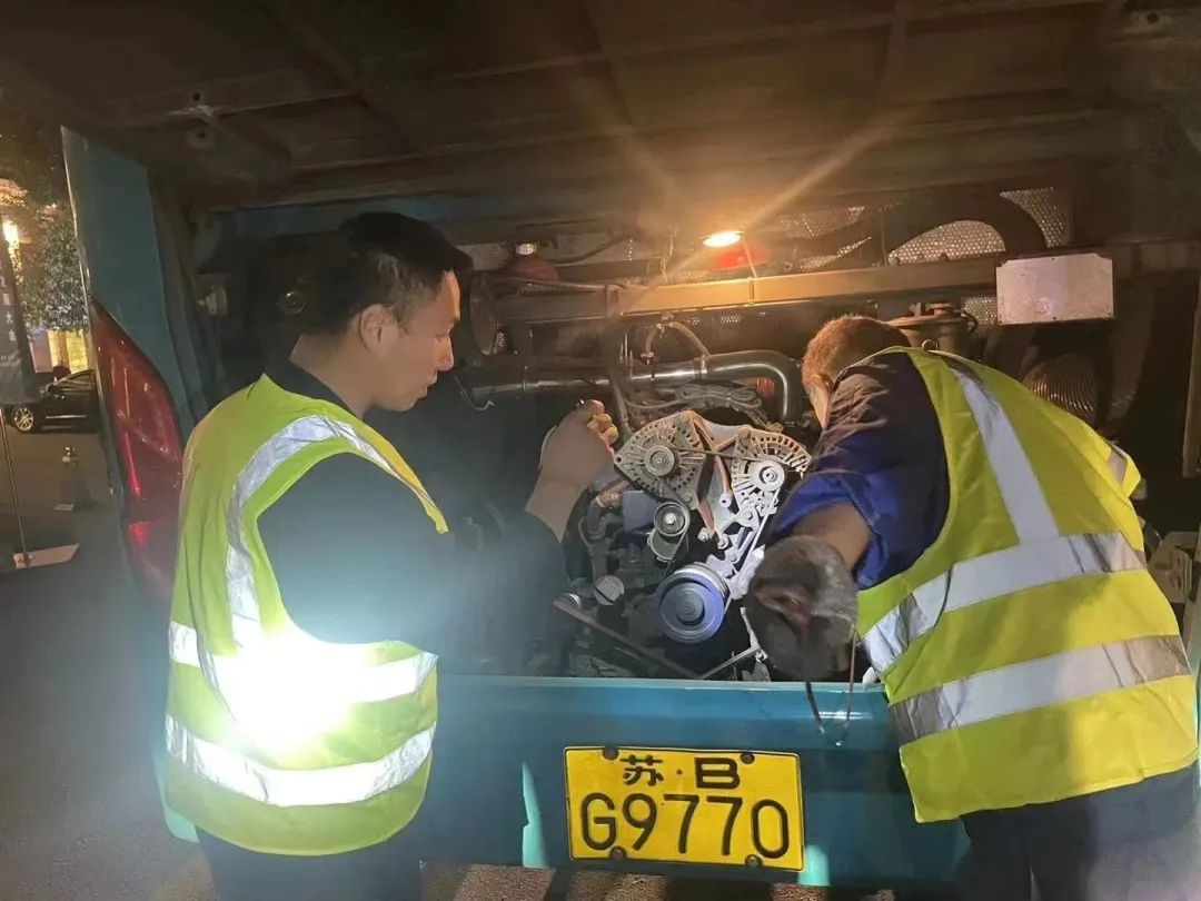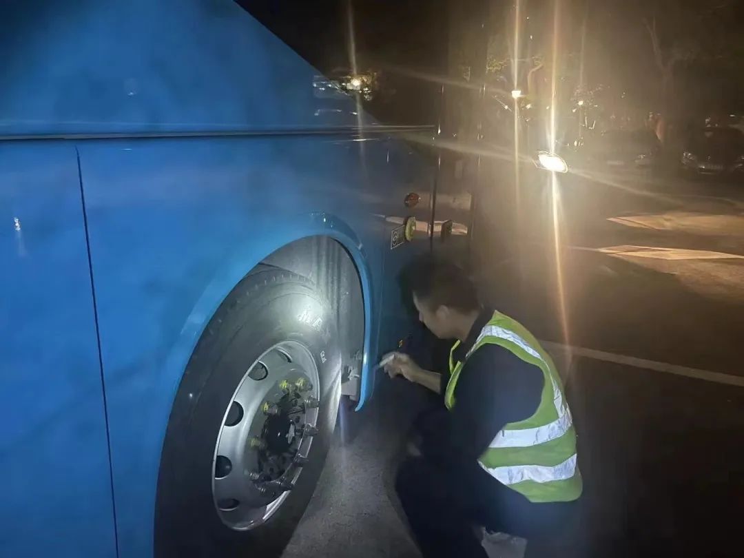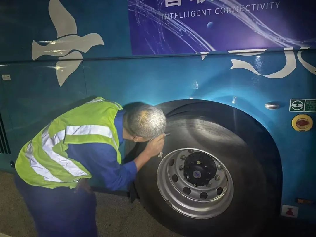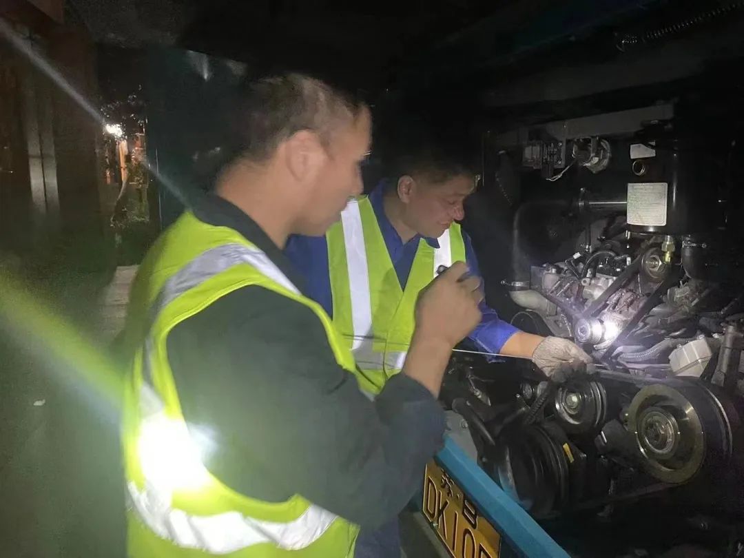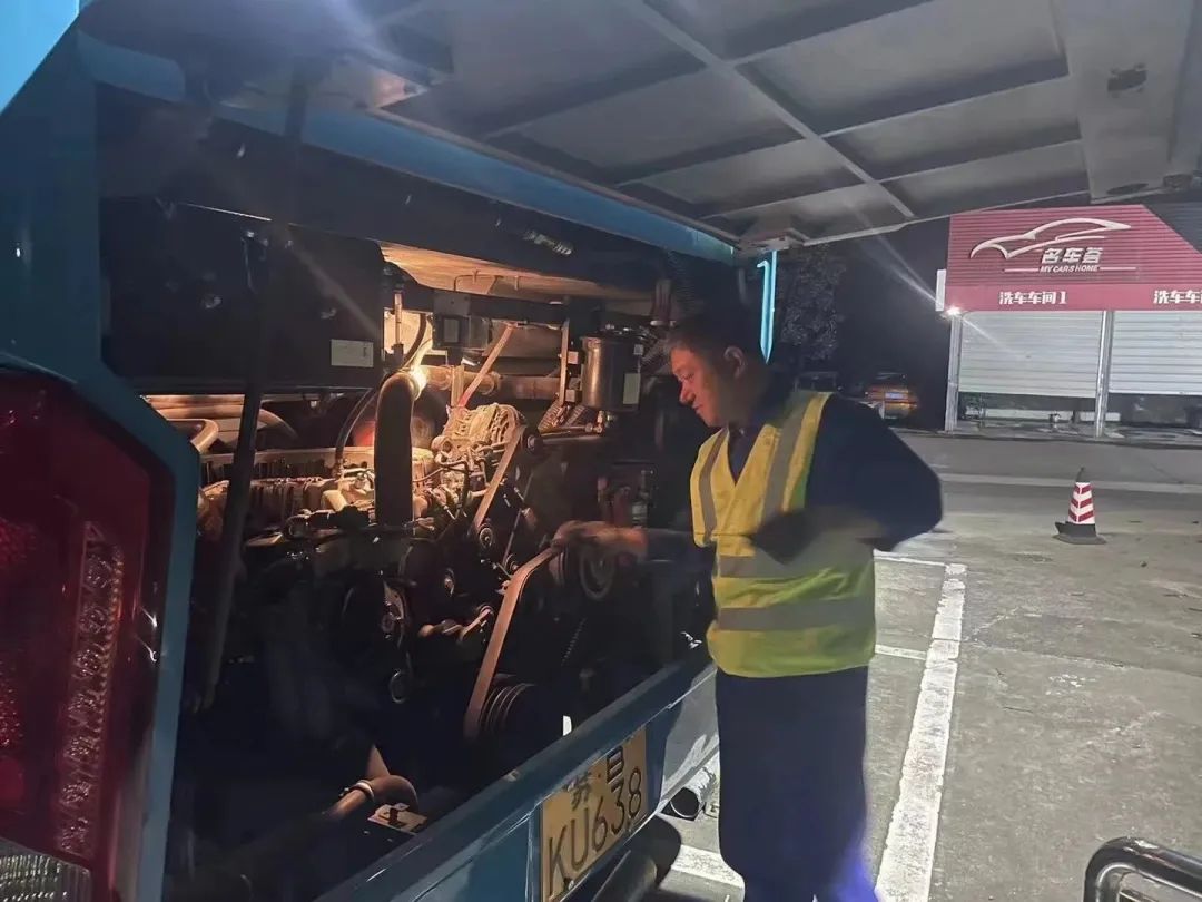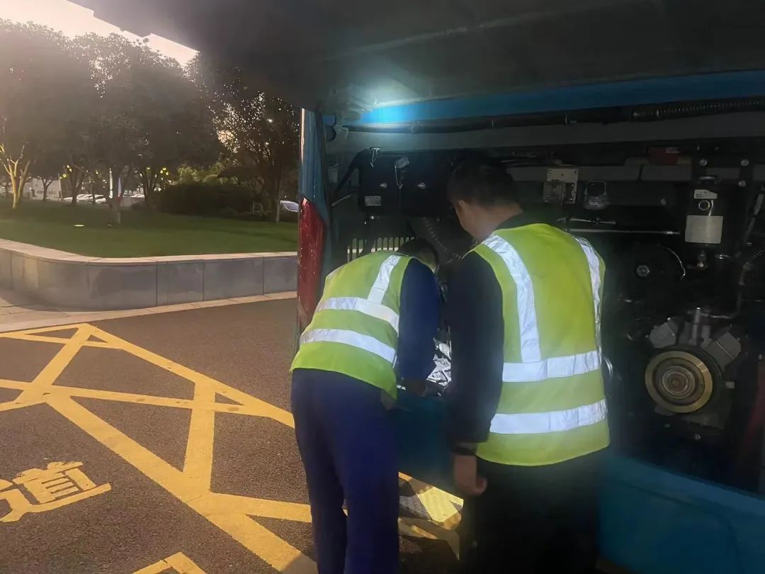 修理厂组织专人成立保障小组,每天到车辆停放的7个点位现场进行收车后的车辆检查工作,发现故障现场解决,确保所有保障车辆安全状况良好。保障小组所有成员精神饱满、通力协作,展现了有序、热情、尽责的公交服务形象。