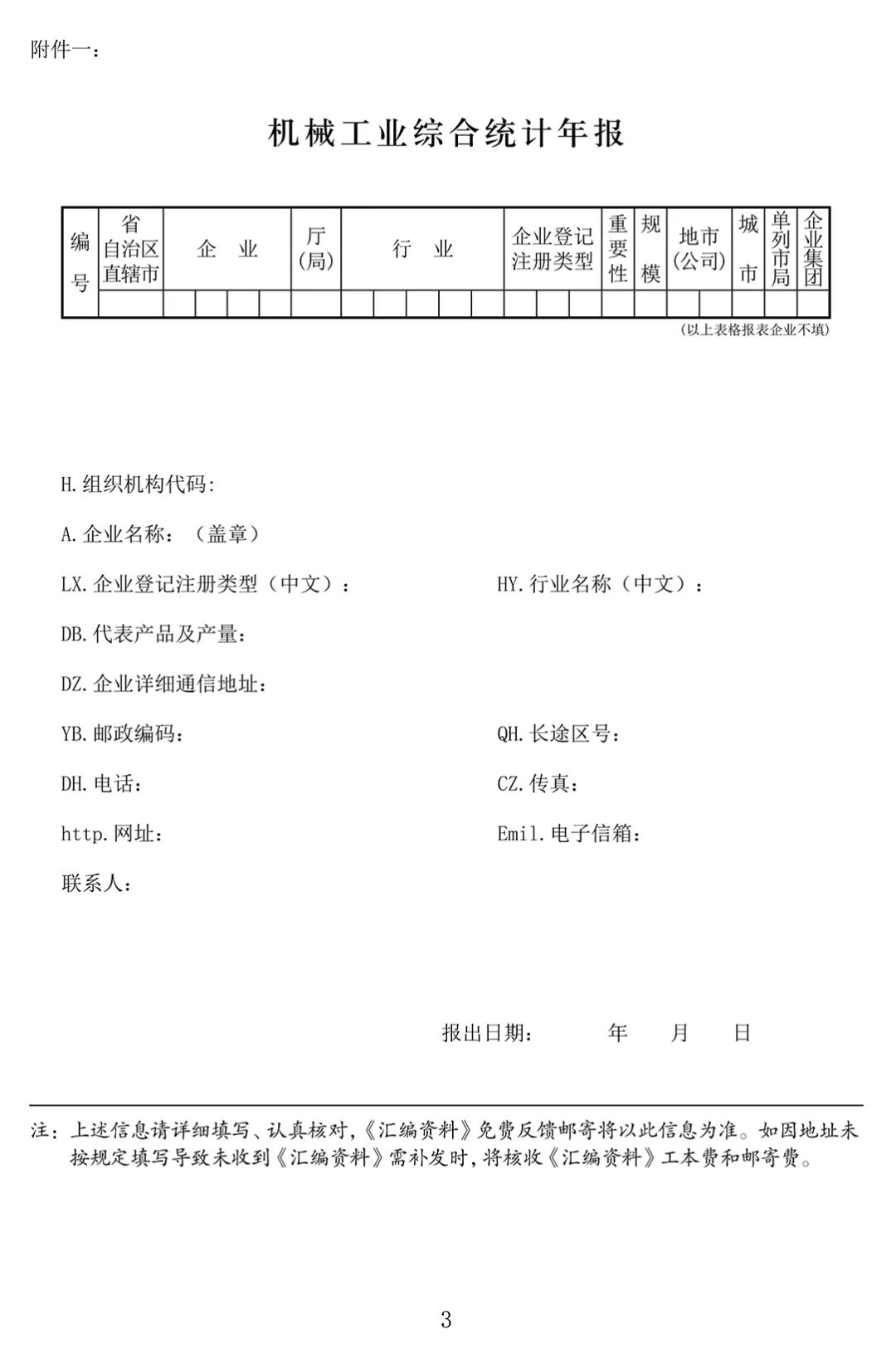 一、机械工业综合统计年报(表1、2、3)