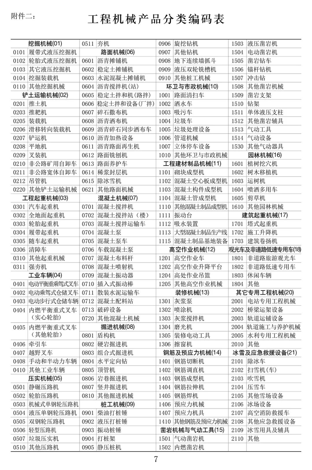 二、工程机械产品分类编码表