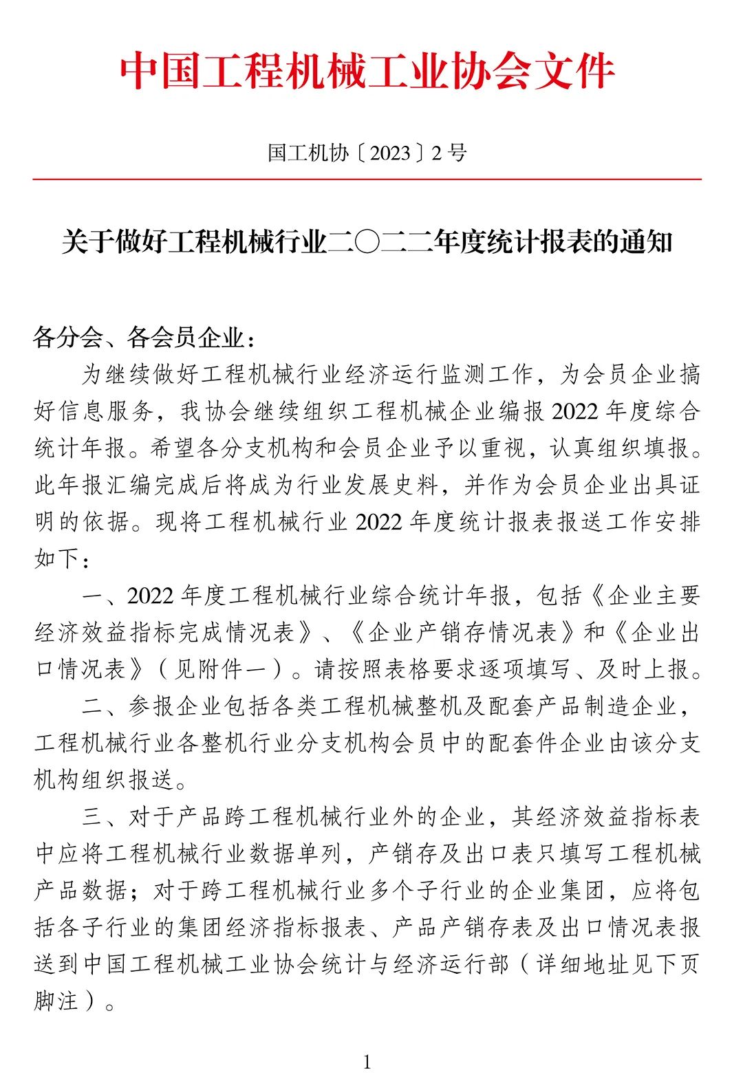 一、2022年度工程机械行业综合统计年报,包括《企业主要经济效益指标完成情况表》、《企业产销存情况表》和《企业出口情况表》(见附件一)。请按照表格要求逐项填写、及时上报。