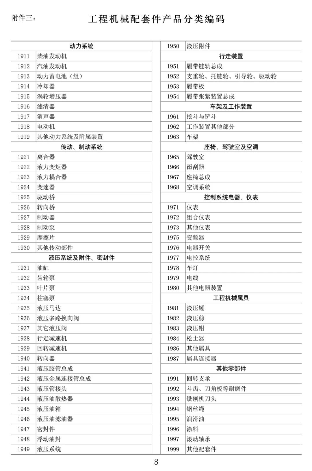 三、工程机械配套件产品分类编码表