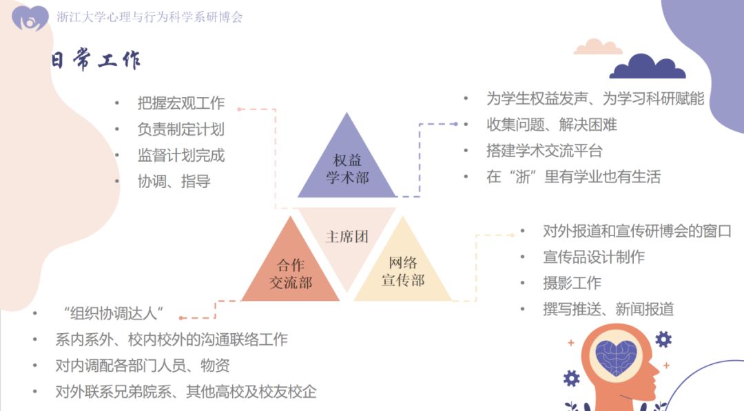 2023年10月15日19:30,心理系第八届研博会在紫金港校区海纳苑3幢521室召开了第一次全体会议。本次会议旨在促进研博会新成员的彼此认识,进一步提升团队凝聚力;同时帮助各部门成员进一步了解各部门工作内容和工作规划,以提高各部门的沟通效率和协作能力。会议由心理系研博会主席团成员林嵩主持。