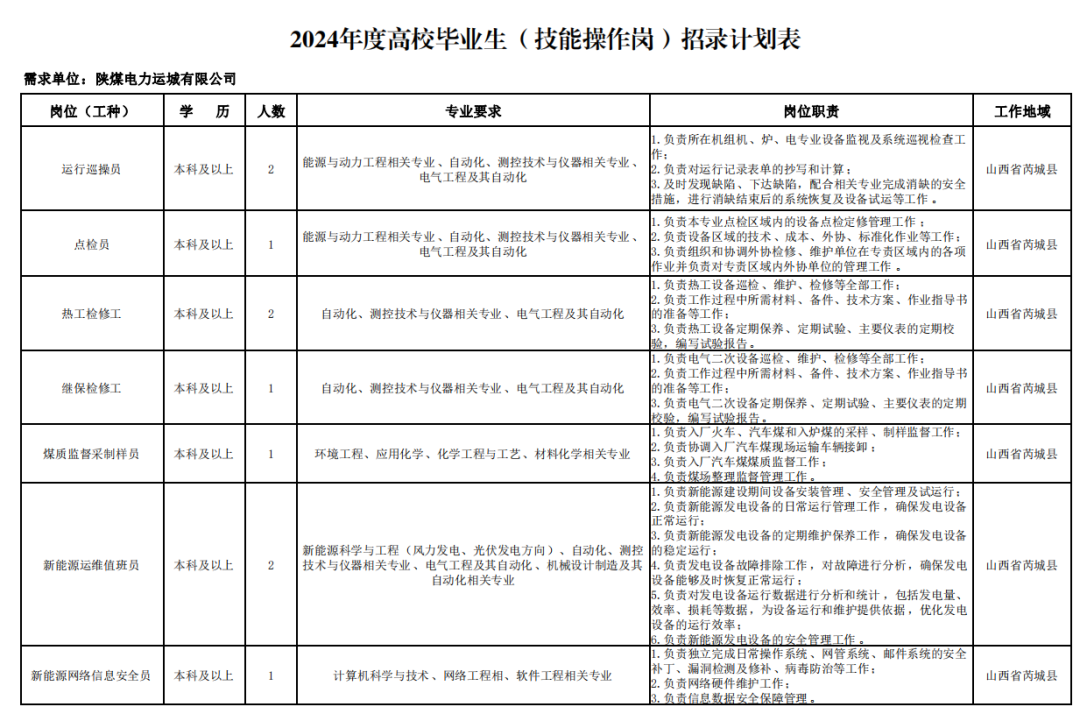 陕西煤业化工集团有限责任公司(简称陕煤集团)是陕西省能源化工产业的骨干企业,也是省内煤炭大基地开发建设的主体。陕煤集团自2004年成立以来,经过19年的改革发展,通过投资新建、收购兼并、资产划转、内部重组等多种途径,形成了“煤炭开采、煤化工、燃煤发电、钢铁冶炼、机械制造、建筑施工、铁路投资、科技、金融、现代服务”等相关多元互补、协调发展的产业格局。旗下二级全资、控股、参股企业60多个,上市公司5家,员工总数14万余人,资产总额达到7200亿元。2022年,陕煤集团全年煤炭产销量跨上2.3亿吨,各类化工产品产量接近2000万吨,发电量突破500亿度,粗钢产量保持在1200万吨水平,其他实物量指标稳中有进。全年实现营业收入5102亿元,实现利润总额603亿元。2015年,集团首次进入《财富》世界500强,连续9年入榜,排名稳步提升,位列2023年世界500强榜单第169位。同时,集团位列2023年中国企业500强榜单第51位,连续3年位居上榜陕企第一。全国普通高等院校及国(境)外院校2024年应届、2022-2023年往届大专以上学历毕业生。1、遵守国家法律法规,遵守社会公德,无刑事犯罪和严重违反校纪校规记录。2、具有良好的政治素质,品行端正、德才兼备,遵守职业道德规范。4、符合招聘岗位学历、专业相关要求,成绩优异,能够取得毕业证书、学位证书。1、通过电子邮件方式报名。应聘人员须同时向陕煤集团及意向单位投递简历和相关证件扫描件。应届毕业生须同时上传学校标准格式的成绩单及学信网学籍在线验证报告,往届毕业生须上传学历、学位证书及学信网学历证书电子注册备案表,留学生须提交教育部学历认证证明。邮件上传方式:以附件形式上传简历及相关资料扫描件。招聘电子邮箱:陕煤集团smjtzp@shccig.com;各单位邮箱详见附件2。2、报名时间:简章发布之日至2024年4月30日。简历投递——简历筛选——资格审查——笔试面试——确定录用人选2、社会保障:养老、医疗、失业、工伤、生育五项基本社会保险及住房公积金、企业年金以及企业补充医疗保险。3、企业福利:享受国家法定节假日、带薪年休假、津补贴、健康体检、员工餐厅、员工公寓、节日福利等各种福利待遇,丰富的文体活动。(福利待遇因行业及企业所在地不同略有差异)4、职业发展:多元化员工培训、多层次人才培养,完善的职业发展通道。1、本招聘信息在陕西煤业化工集团有限责任公司及所属单位、各高校和上级主管部门指定网站发布。本招聘不收取任何费用,应聘人员须认真甄别网站或其他方式发布的陕煤集团公开招聘公告,谨防受骗。2、除发布的报名方式外,不接受其他方式报名,应聘人员须向指定报名邮箱投递简历。3、应聘人员应认真对照学历层次和专业要求进行申报,最多可申报3个单位。4、应聘人员对个人所提供信息的真实性负责,如发现虚假信息,取消应聘资格。5、用人单位将结合报名情况适时组织笔试、面试和公示,择优录用。报名期内招满为止,报名期满不再接受报名。