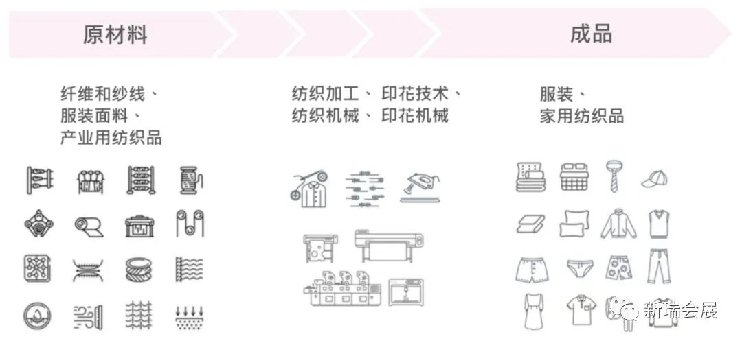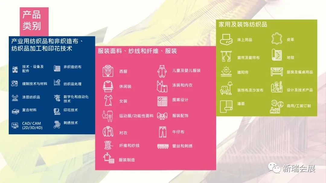 服装、服装面料、纱线和纤维:西装、休闲服、女装、运动服、功能性面料、衬衫、牛仔、童装及婴儿服、泳衣及内衣、针织品, 针织物、编织、针织袜子类、服装纺织品。