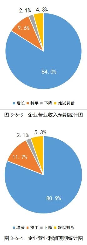 在经营收入预期方面,有84%的调研企业表示其2023全年营业收入预期为增加,这一数字较上年翻了一番;在经营利润预期方面,有80.9%的调研企业表示其2023全年营业利润预期为增加,而这一数字在上一年仅为37.9%。
