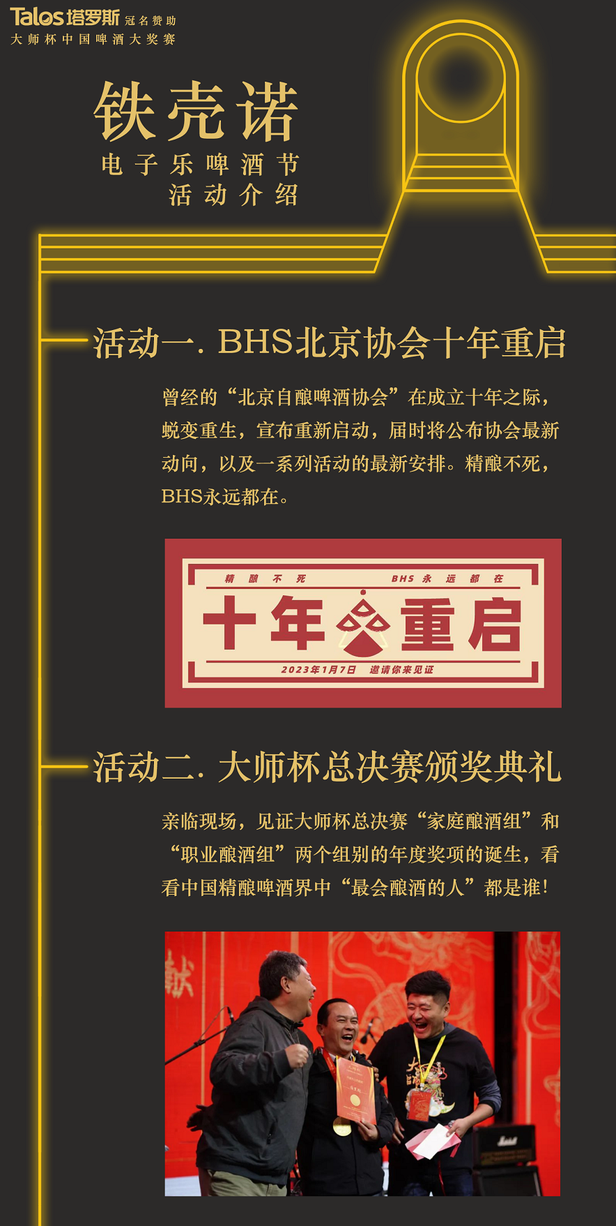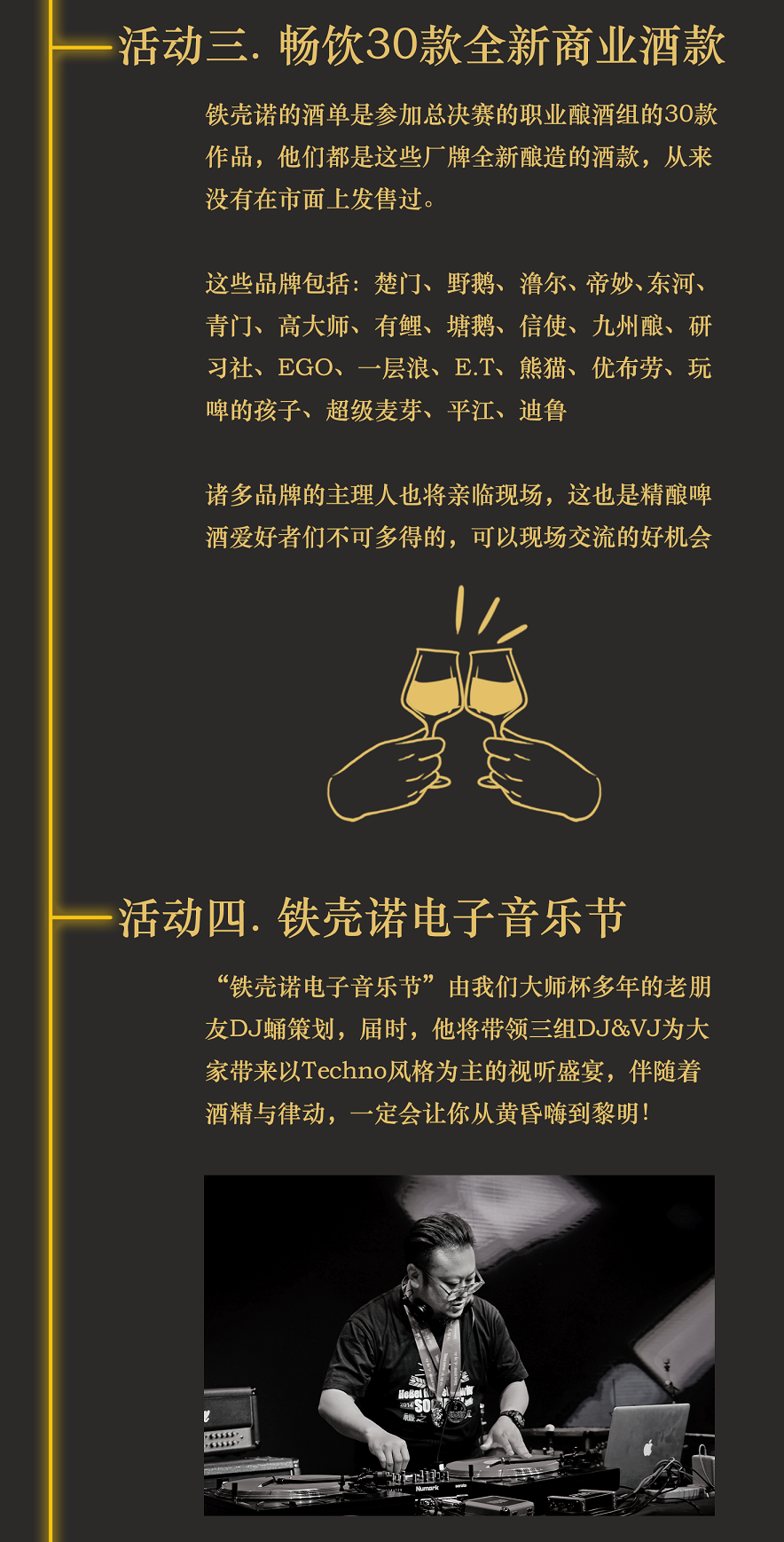 1月7日,铁壳诺电子乐啤酒节为你带来30款大师级未经发售的全新酒款畅饮体验。所有酒款均为第十一届塔罗斯·大师杯总决赛入围厂牌酿造,每款都有冲击总冠军的实力。