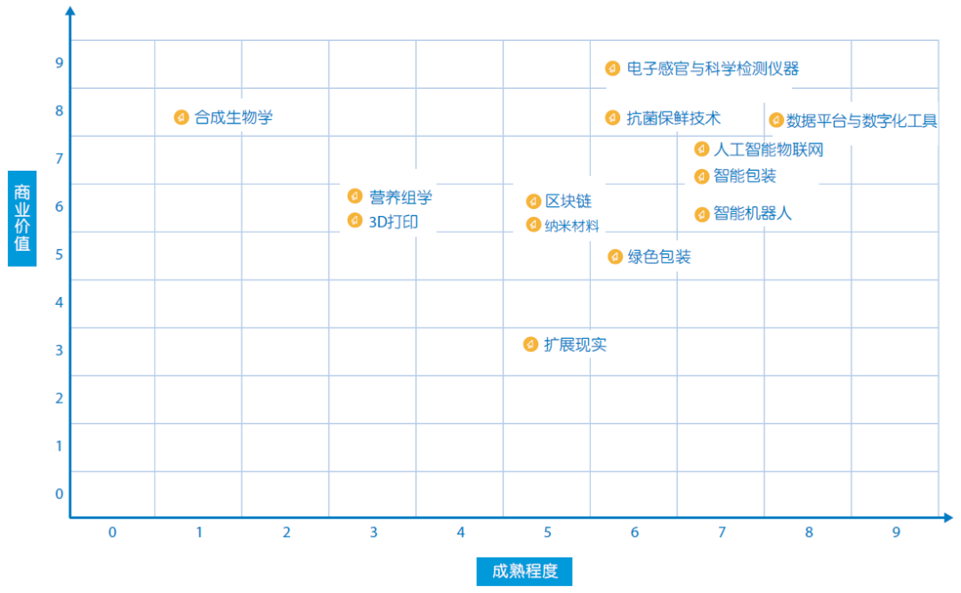 13项食品行业创新技术的成熟程度与商业价值矩阵