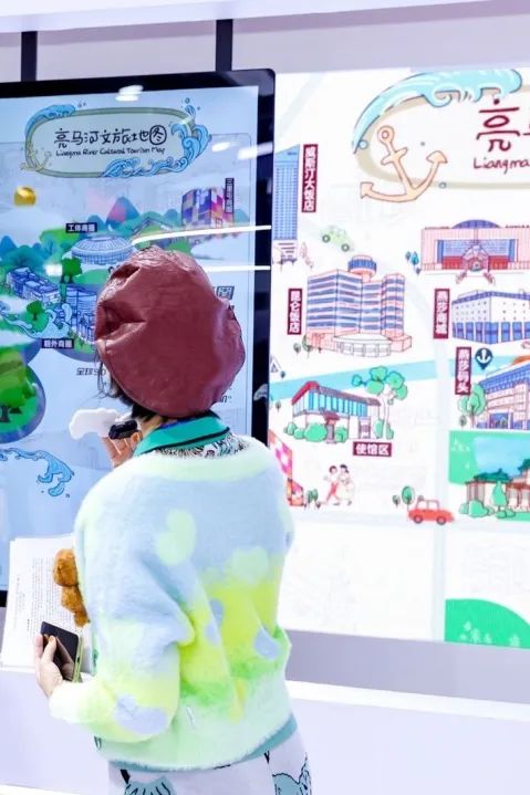 在一面滑轨屏上,亮马河文旅地图以“亮马河的1000种生活方式”为切入点铺陈展开,沿途尽览“1河2湖24桥18景”,串联起三里屯商圈、燕莎商圈、蓝港商圈、朝阳公园、郡王府等诸多朝阳知名景点和消费空间。