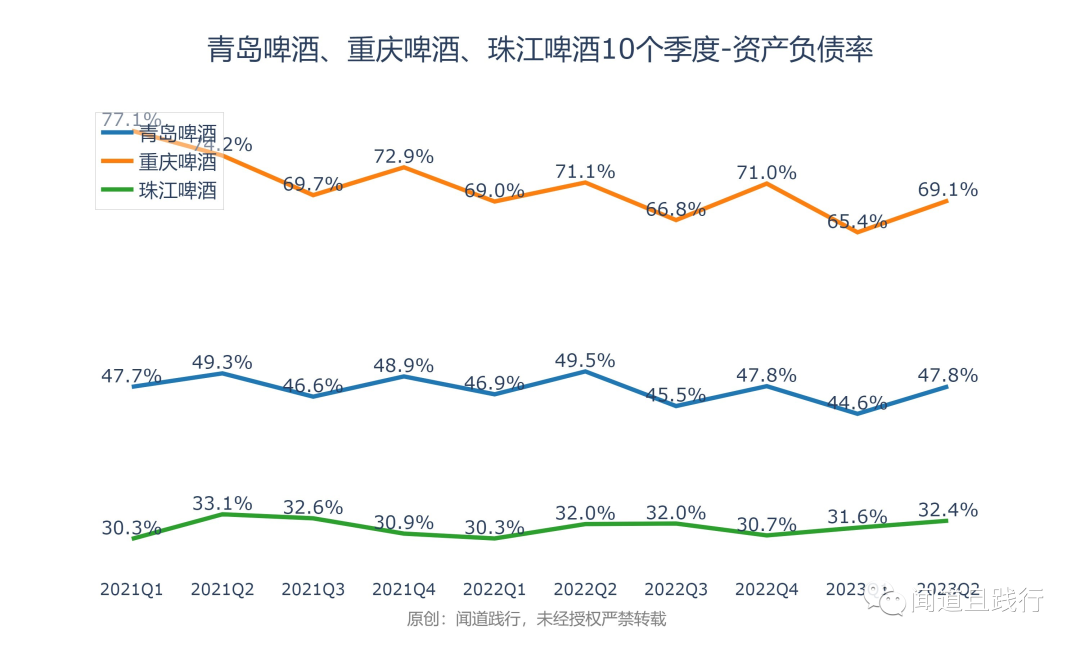 资产负债率,重庆啤酒最高,其次是青岛啤酒,珠江啤酒第三。