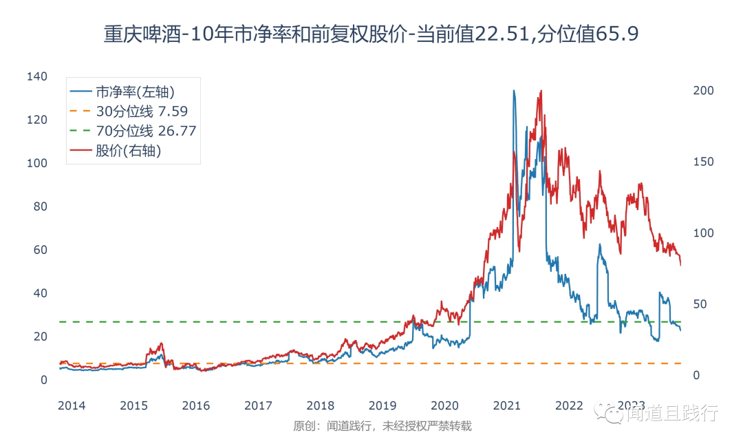 目前重庆啤酒的市净率为22,处于10年来65的分位值: