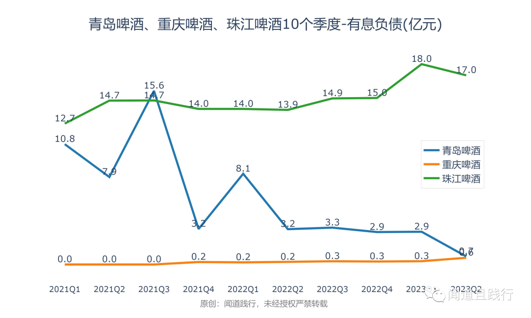 有息负债,珠江啤酒最高,其次是青岛啤酒,重庆啤酒第三。