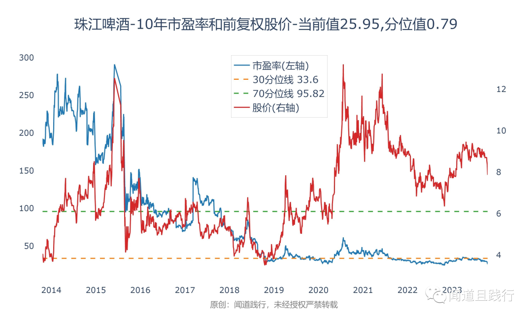 目前珠江啤酒的滚动市盈率为25,处于10年来0.79的分位值: