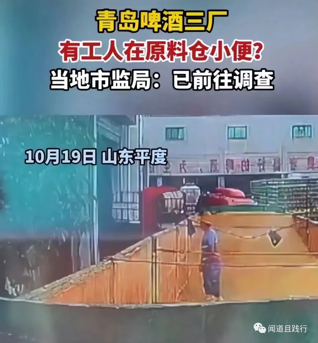 视频显示,在青岛啤酒三厂,一名工人趁众人不备,爬越高高的原料仓壁,进入原料仓。然后环顾左右确认没人后,果断拉开拉链放水,这一泡尿让网友惊骇,也让百年青啤名誉尽丧,元气大伤。