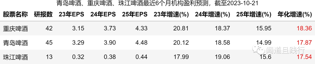 按机构的预测,重庆啤酒增速最快,年化增速18%;珠江啤酒增速最慢,年化增速17%。
