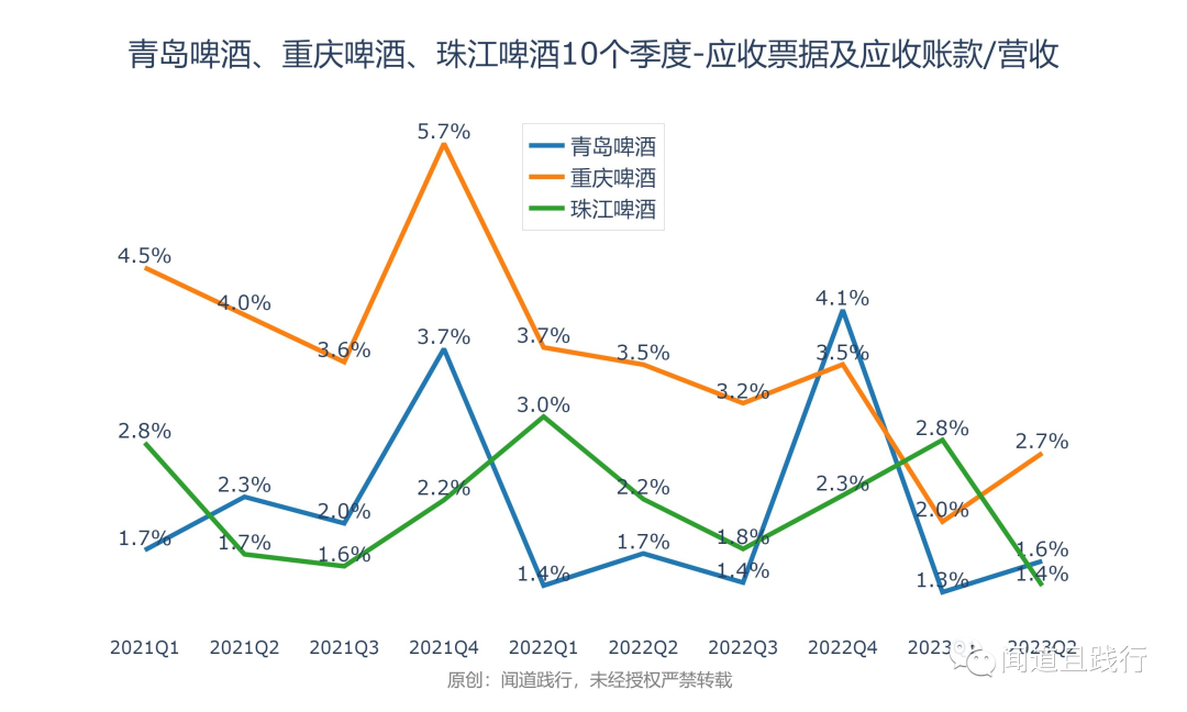 应收账款占营收的比例,重庆啤酒最高,其次是青岛啤酒,珠江啤酒第三。