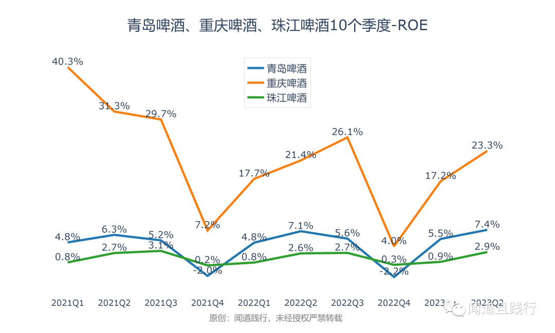 净资产收益率,重庆啤酒最高,其次是青岛啤酒,珠江啤酒第三。