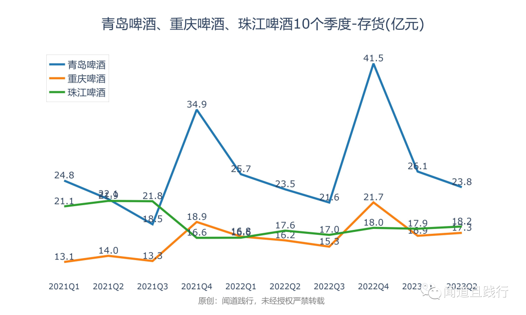 存货,青岛啤酒最高,其次是珠江啤酒,重庆啤酒第三。