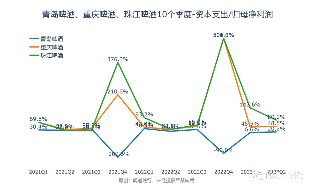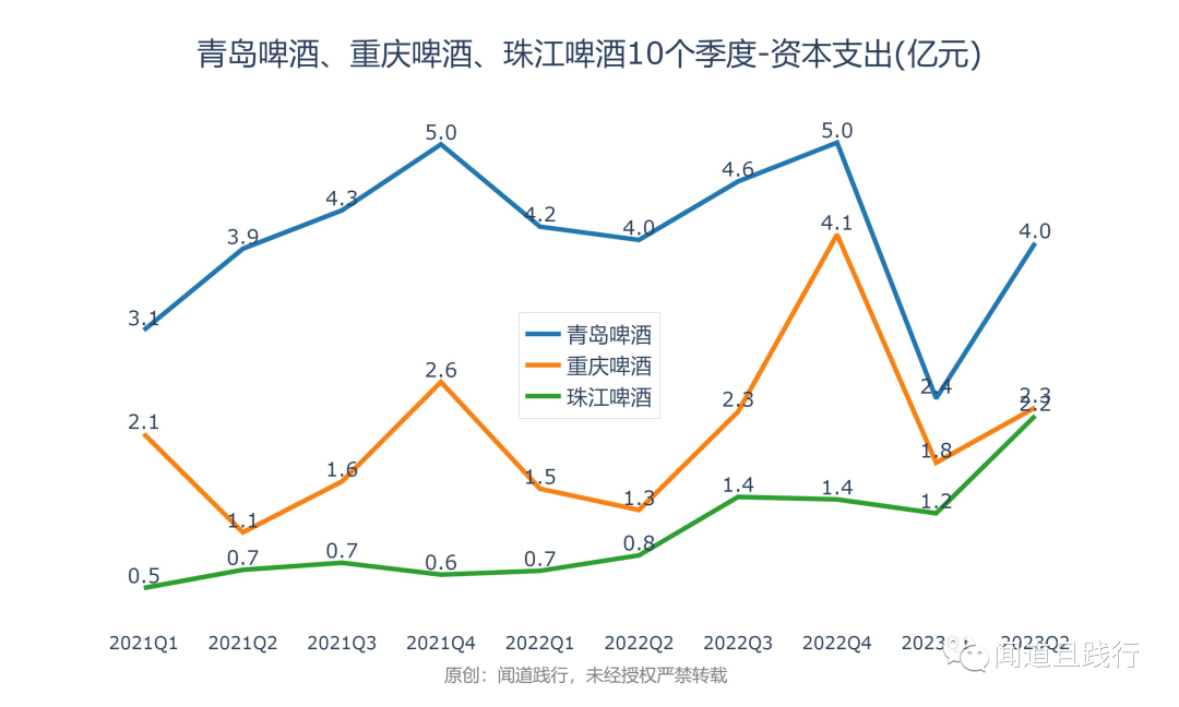 资本支出,青岛啤酒最高,其次是重庆啤酒,珠江啤酒第三。