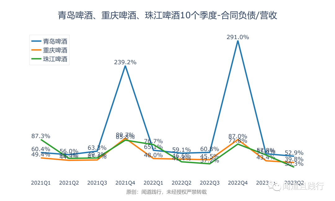 合同负债占营收的比例,青岛啤酒最高,其次是重庆啤酒,珠江啤酒第三。