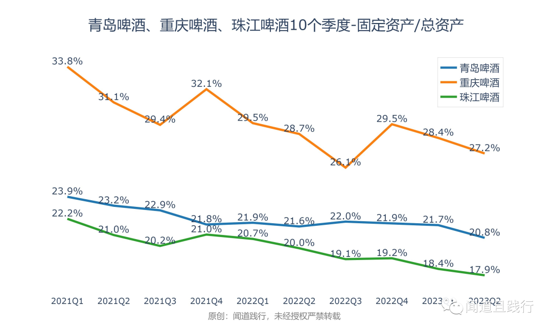 固定资产占总资产的比例,重庆啤酒最高,其次是青岛啤酒,珠江啤酒第三。