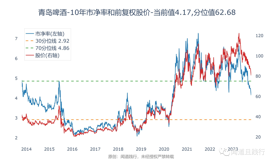 目前青岛啤酒的市净率为4.17,处于10年来62的分位值: