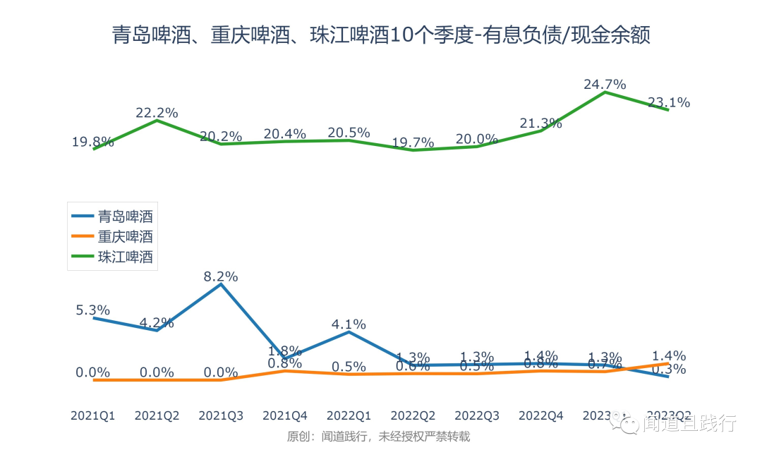 现金余额,青岛啤酒最高,其次是珠江啤酒,重庆啤酒第三。
