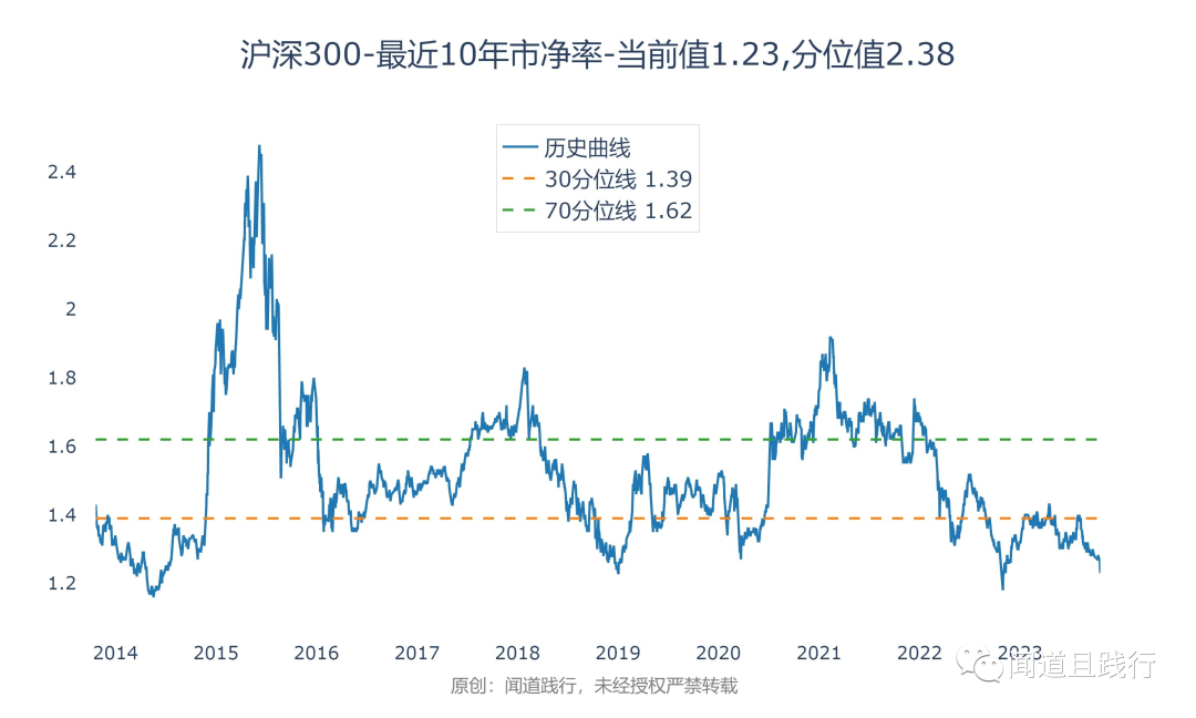 目前沪深300市净率为1.23,处于10年来2.38的分位值: