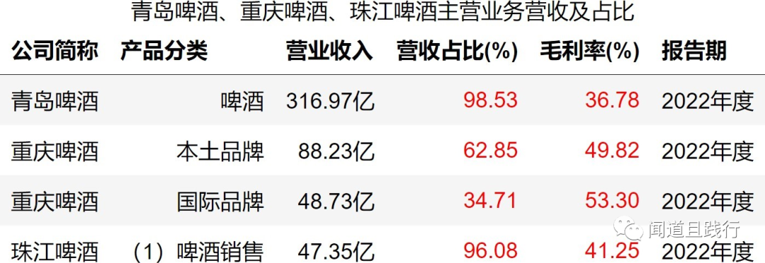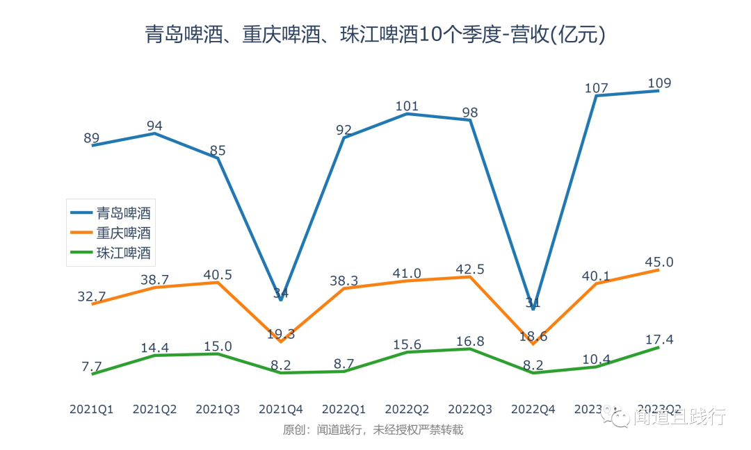 营收,青岛啤酒最高,其次是重庆啤酒,珠江啤酒第三。
