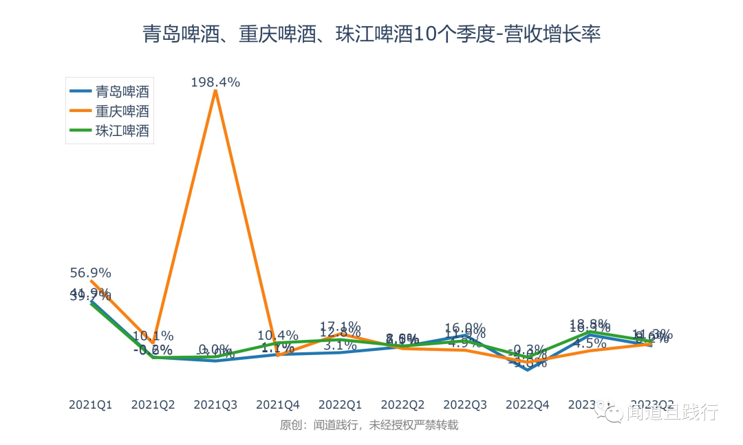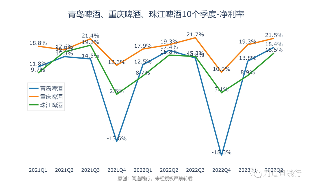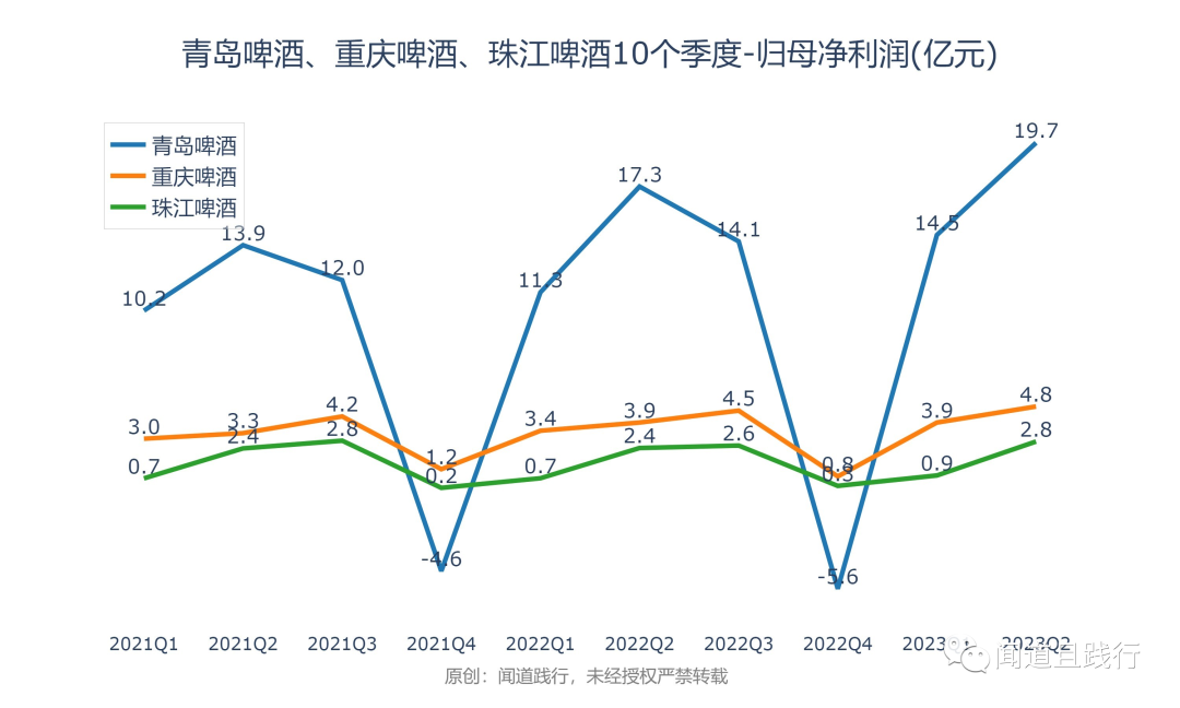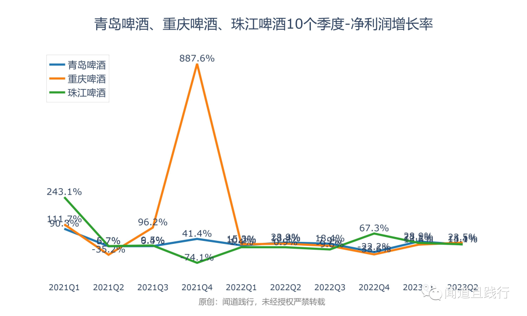 净利润增速,珠江啤酒最快,其次是青岛啤酒,重庆啤酒第三。