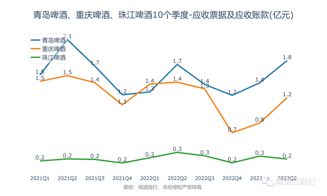 应收账款,青岛啤酒最高,其次是重庆啤酒,珠江啤酒第三。