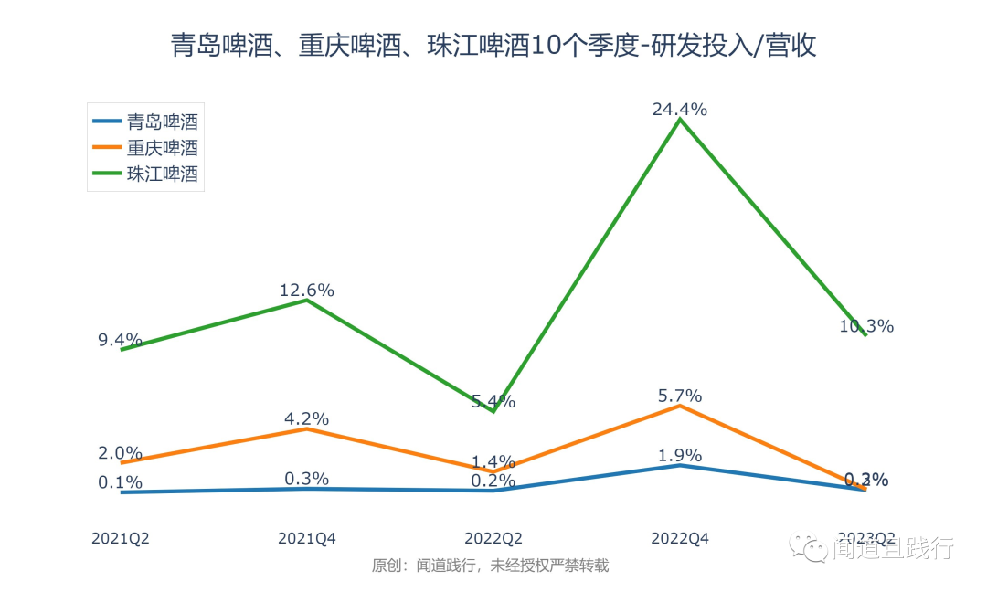 研发投入占营收的比例,珠江啤酒最高,其次是重庆啤酒,青岛啤酒第三。