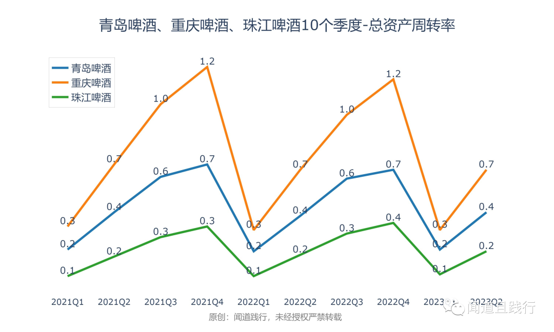 总资产周转率,重庆啤酒最高,其次是青岛啤酒,珠江啤酒第三。