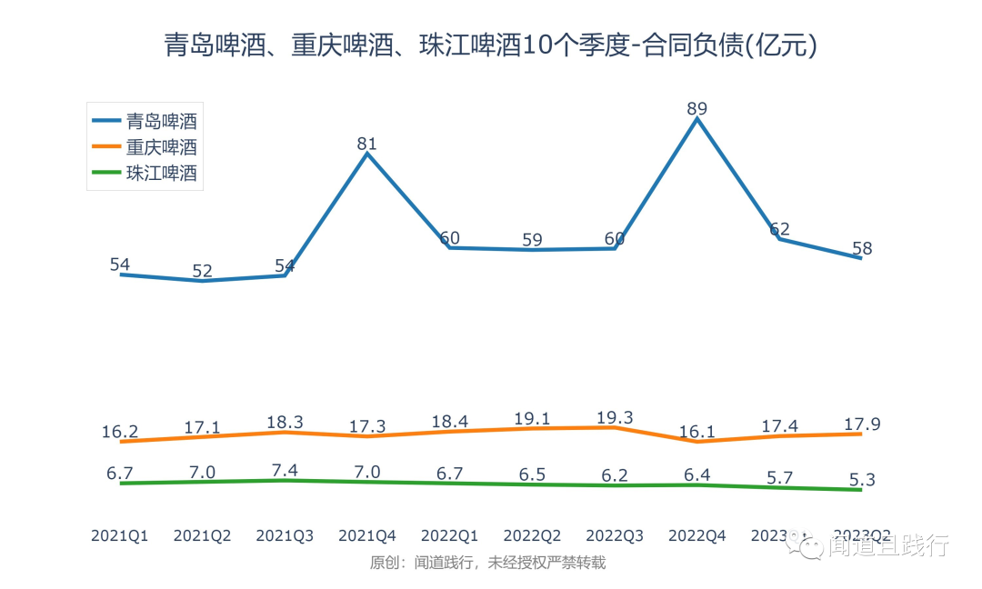 合同负债,青岛啤酒最高,其次是重庆啤酒,珠江啤酒第三。