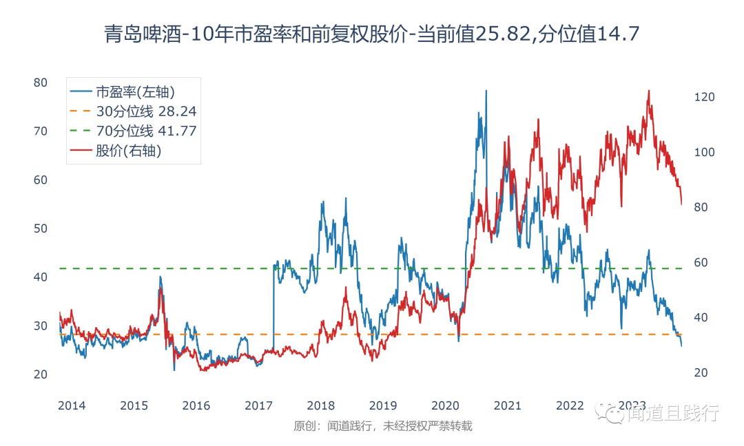 目前青岛啤酒的滚动市盈率为25,处于10年来14的分位值: