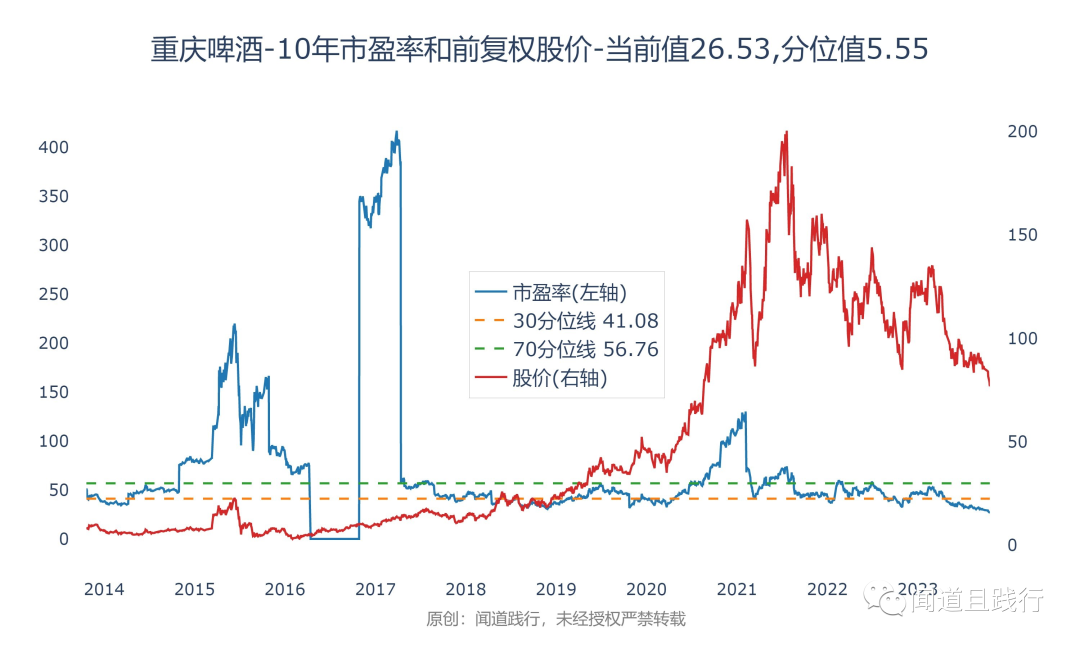 目前重庆啤酒的滚动市盈率为26,处于10年来5的分位值: