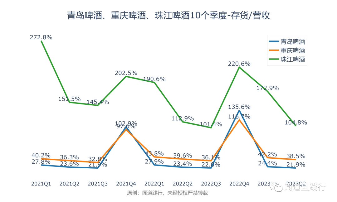 存货占营收的比例,珠江啤酒最高,其次是重庆啤酒,青岛啤酒第三。