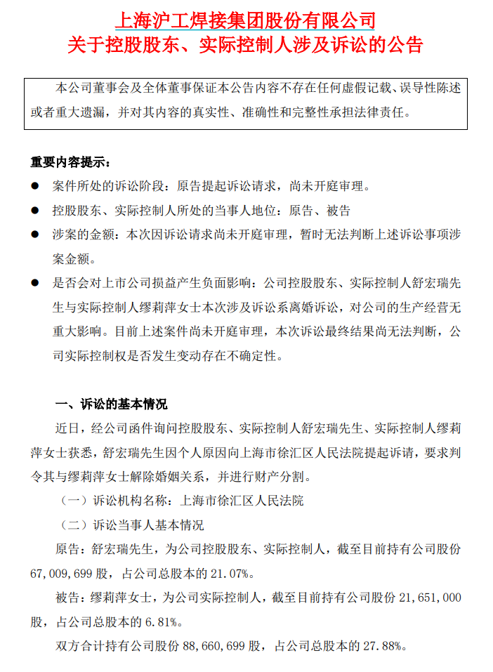18日晚间,上海沪工公告称,近日,经公司函件询问控股股东、实际控制人舒宏瑞、实际控制人缪莉萍获悉,舒宏瑞因个人原因向上海市徐汇区人民法院提起诉请,要求判令其与缪莉萍解除婚姻关系,并进行财产分割。公告称,舒宏瑞与缪莉萍本次涉及诉讼系离婚诉讼,对公司的生产经营无重大影响。目前上述案件尚未开庭审理,本次诉讼最终结果尚无法判断,公司实际控制权是否发生变动存在不确定性。公开资料显示,舒宏瑞,1951年出生,中国国籍,无境外居留权,硕士学位。1993年1月至2011年9月历任上海沪工电焊机厂厂长,上海大公电气有限公司执行董事、总经理,上海沪工电焊机制造有限公司执行董事、总经理,上海沪工电焊机(集团)有限公司董事长。2011年10月起担任上海沪工焊接集团股份有限公司董事长。目前已经卸任董事长一职。此外,上海沪工家族控股特征明显。舒宏瑞与缪莉萍是夫妻关系,持有18%股份的舒振宇是他们的儿子。