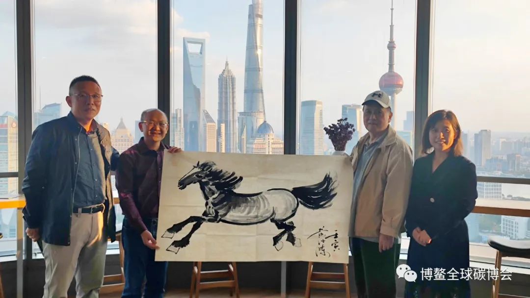 博鳌全球碳博会秘书长黄俊杰向出席研讨会的嘉宾上海市宏观经济学会环境能源经济专业委员会主任许泽成赠送《马到成功》亲笔画作
