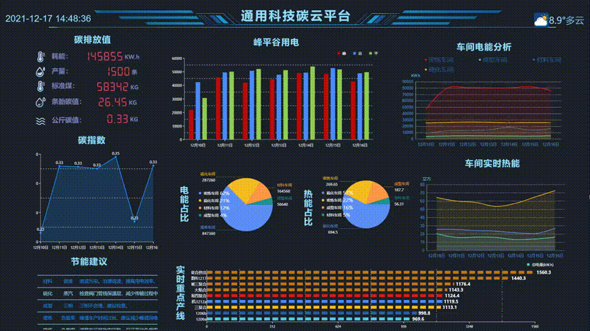 采用能耗碳云平台后,密炼、硫化、材料、成型四个车间500多台设备、128个重点点位综合能耗实时监测、分析和预测,能耗异常信息自动推送并提供优化方案,管理效率提升50%,每月用能同比降低0.5%。