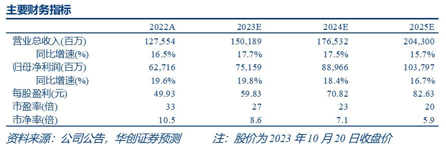 公司发布2023年三季报,前三季度实现营收1032.7亿元,同增18.5%;归母净利润528.8亿元,同增19.1%;其中单Q3实现营收336.9亿元,同增14.0%;归母净利润169.0亿元,同增15.7%。销售回款421.8亿元,同增21.0%,Q3末合同负债113.9亿元,环比Q2末增加40.6亿元。