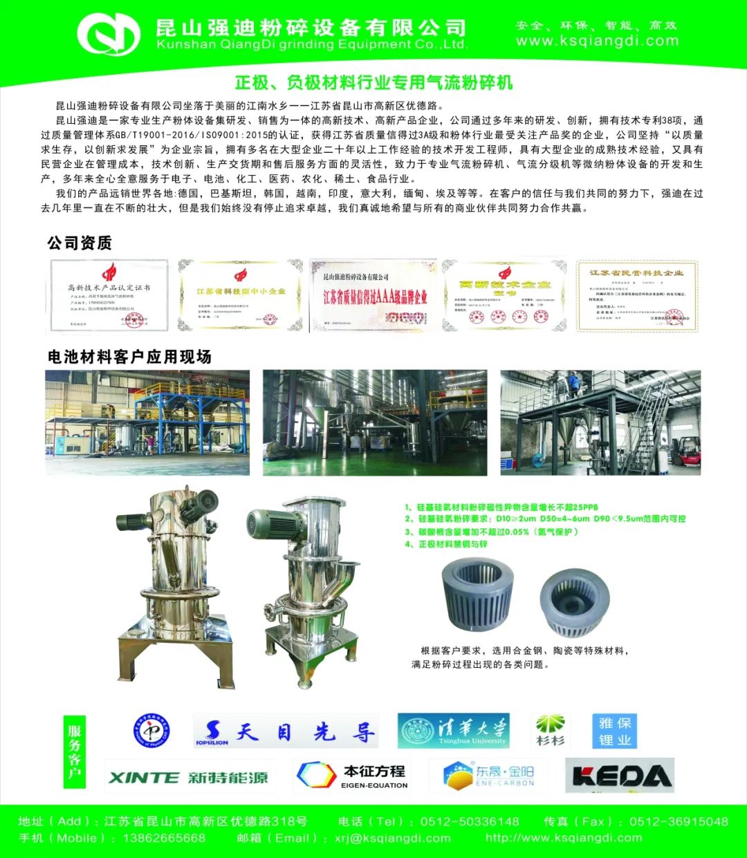 昆山强迪粉碎设备有限公司坐落于美丽的江南水乡一一江苏省昆山市高新区优德路。公司坚持”以质量求生存,以创新求发展'为企业宗旨,多年来全心全意的服务于客户,企业通过IS09001:2008企业质量认证 。