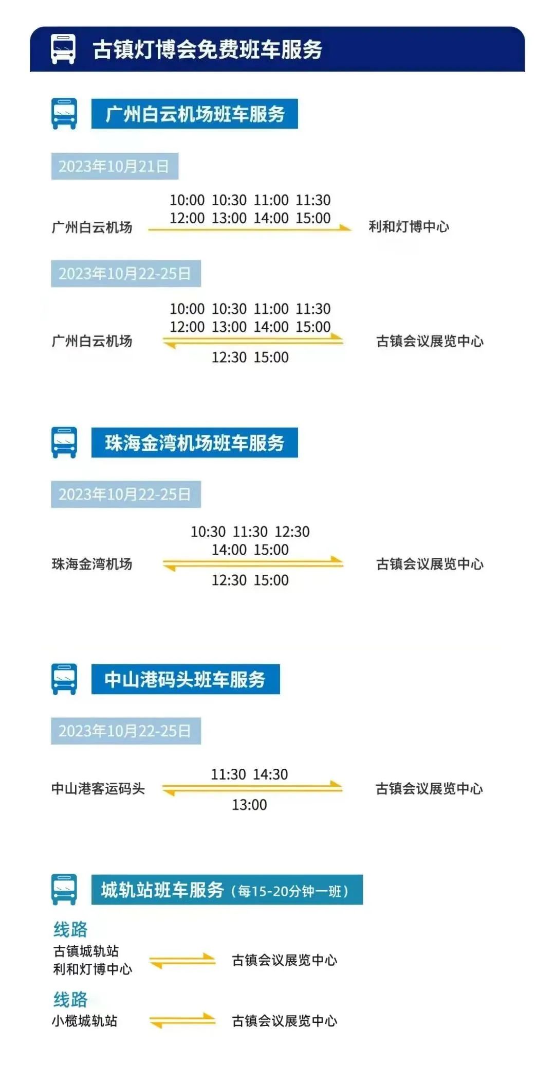 古镇镇内免费接送车路线:古镇会议展览中心→古镇轻轨站→利和灯博中心→古镇会议展览中心