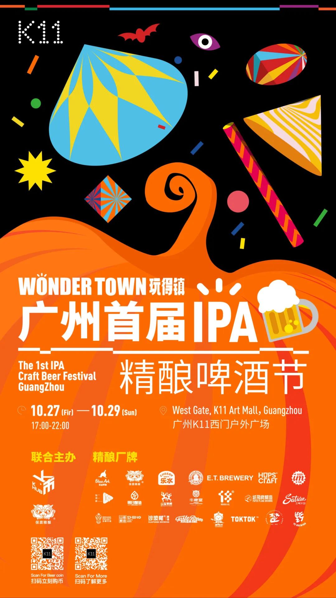 K11携手Bravo保霖精酿共同举办广州首届IPA精酿啤酒节。22个全国及本地精酿厂牌,各家招牌及实验款IPA啤酒,还有南瓜味限定新酒,变装及演出!