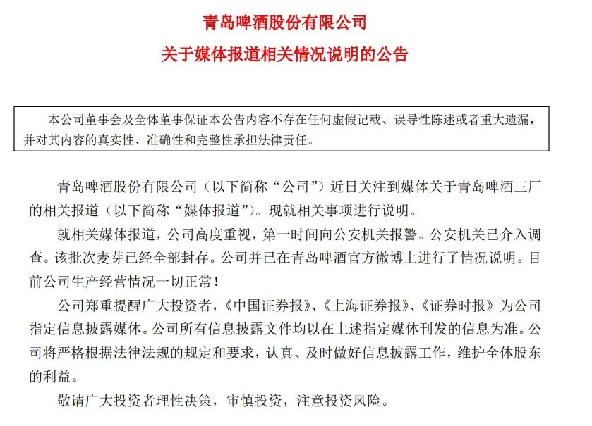 公告称,就相关媒体报道,公司高度重视,第一时间向公安机关报警。公安机关已介入调查。该批次麦芽已经全部封存。公司并已在青岛啤酒官方微博上进行了情况说明。目前公司生产经营情况一切正常。