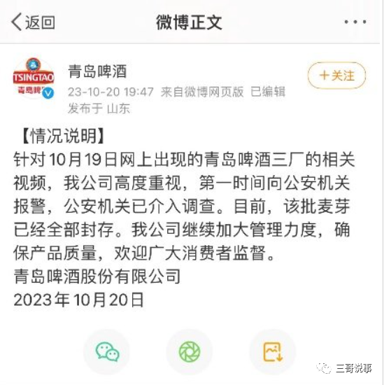 面对危机,青岛啤酒的反应速度值得肯定。他们迅速做出回应,第一时间向公安机关报警,并对涉事的原料进行了全面封存。这种高效的危机处理方式,在一定程度上减轻了公众的疑虑,也体现了企业对此事的重视程度。