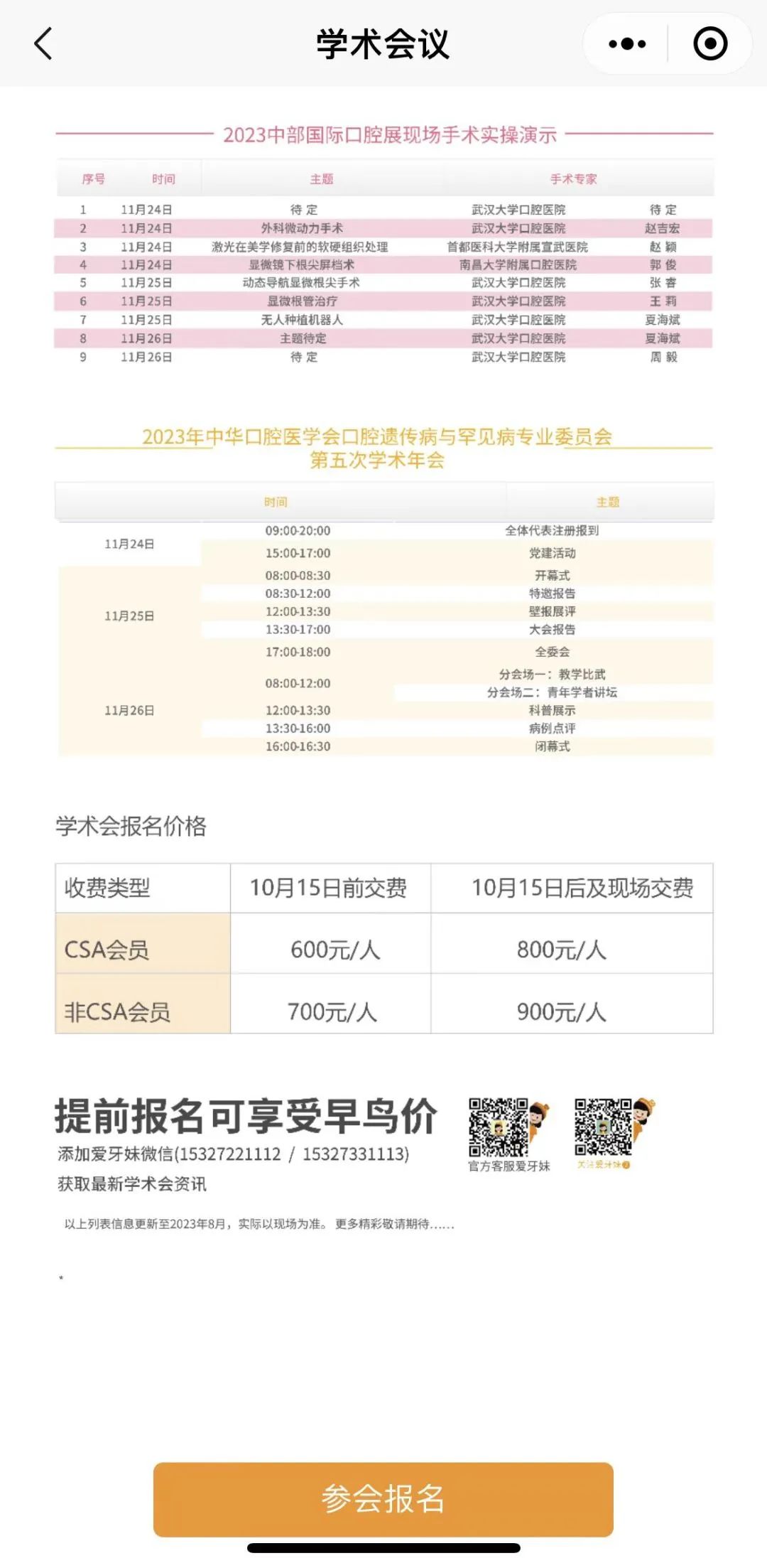 学术会议报名:小程序首页进入学术会议注册专区,或点击学术会议按钮查看详细日程,便捷支付提交报名,保存参会凭证。注:10月15日前报名缴费享早鸟价!