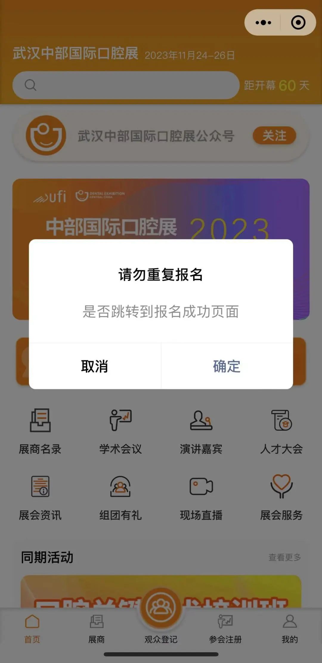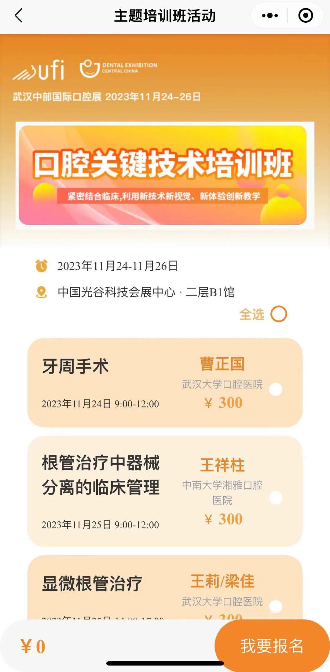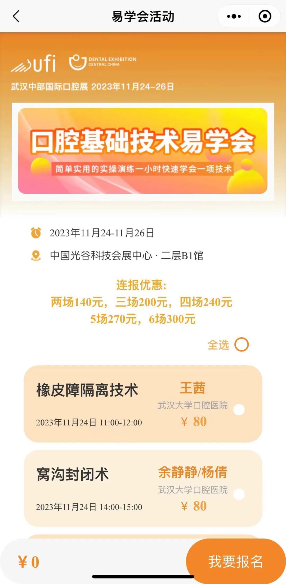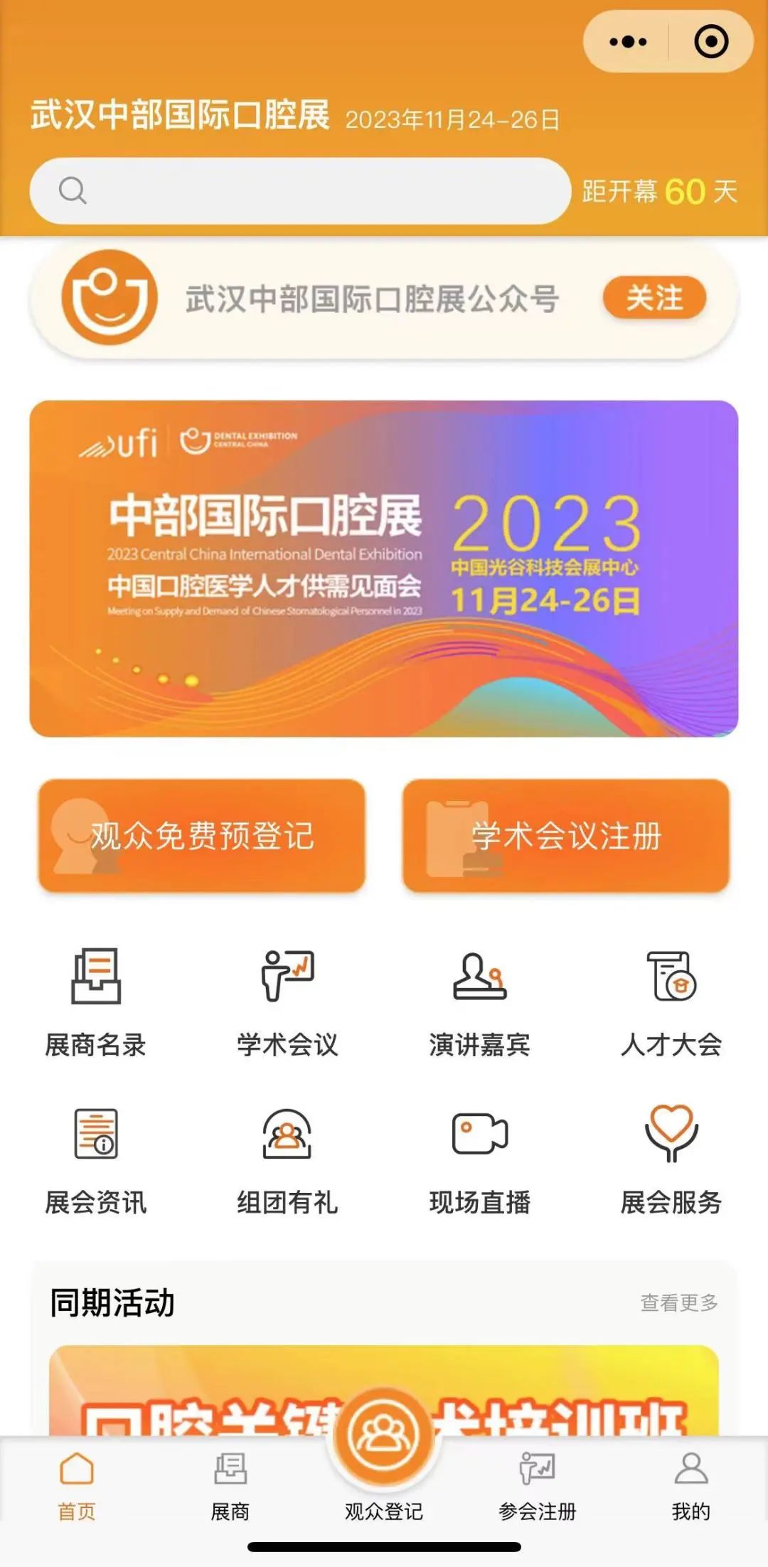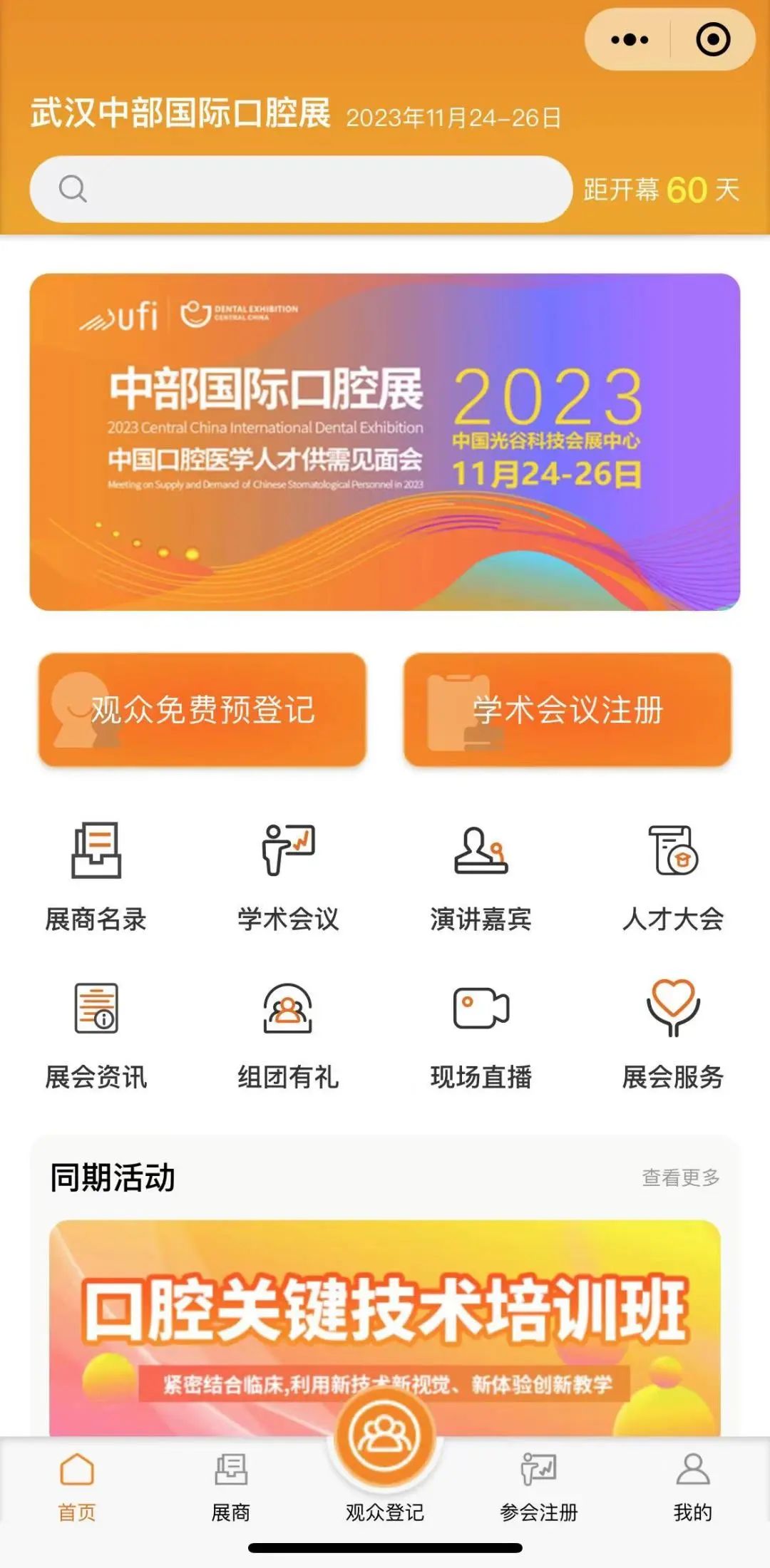 同期活动报名:小程序首页进入同期活动专区,点击进入口腔关键技术培训班、口腔基础技术易学会,按需选择,便捷支付提交报名,保存参会凭证。注:名额有限,报满即止!